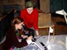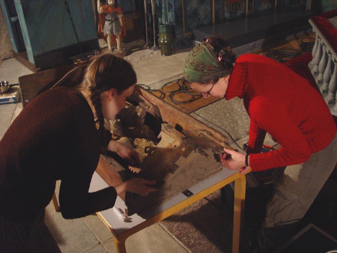 Pyhän Olavin yläkoristelaudat irrotettiin tappikiinnityksestä ja liimauksesta vuosilustojen mittausta varten. Irrotustyössä restauroijat Minna Oikarinen ja Kristiina Pyörälä. |