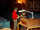 Pyhän Olavin veistoskaapin taustalauta mitattavana lustomikroskoopin edessä. Mittaamassa KP. |