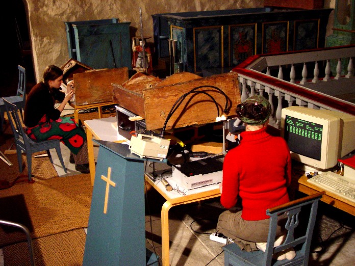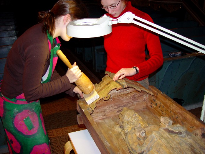 Lopuksi veistokset sijoitettiin takaisin alkuperäisille sijoilleen. Ajoitustyön seuraavana vaiheena on veistoskaappien osista mitattujen vuosilustosarjojen ajoittaminen Dendrokronologian laboratoriossa. |