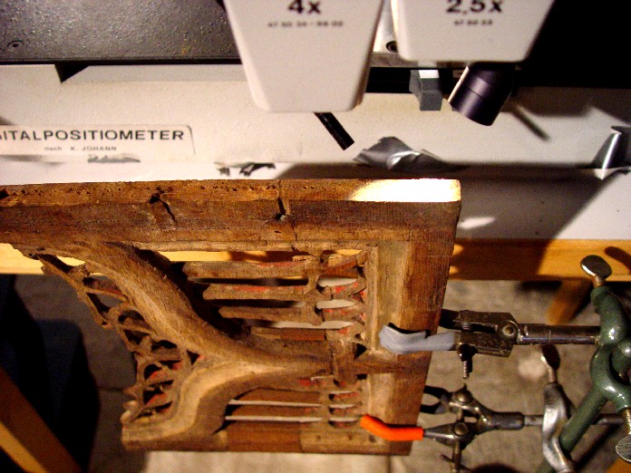 Toinen Pyhän Olavin veistoskaapin yläkoristelaudasta mitattavana lustomikroskoopin alla. |