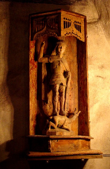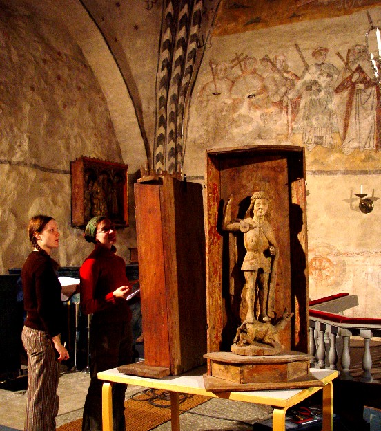 Iänmääritystutkimuksen kohteena ovat Rymättylän vanhan kivikirkon (vas.) keskiaikaisten veistosten Pyhä Olavi ja Pyhä Yrjänä kehyskaapit. |